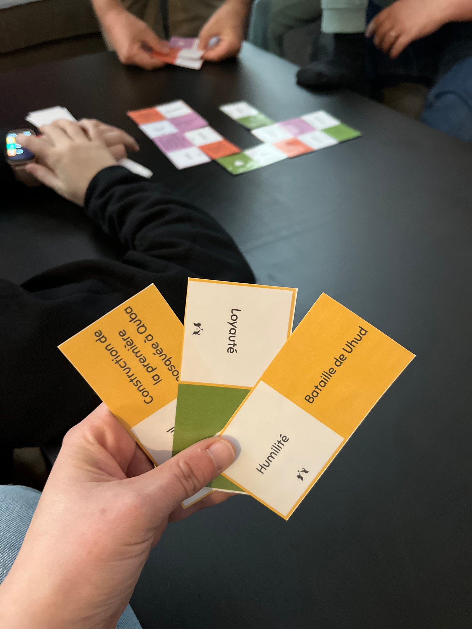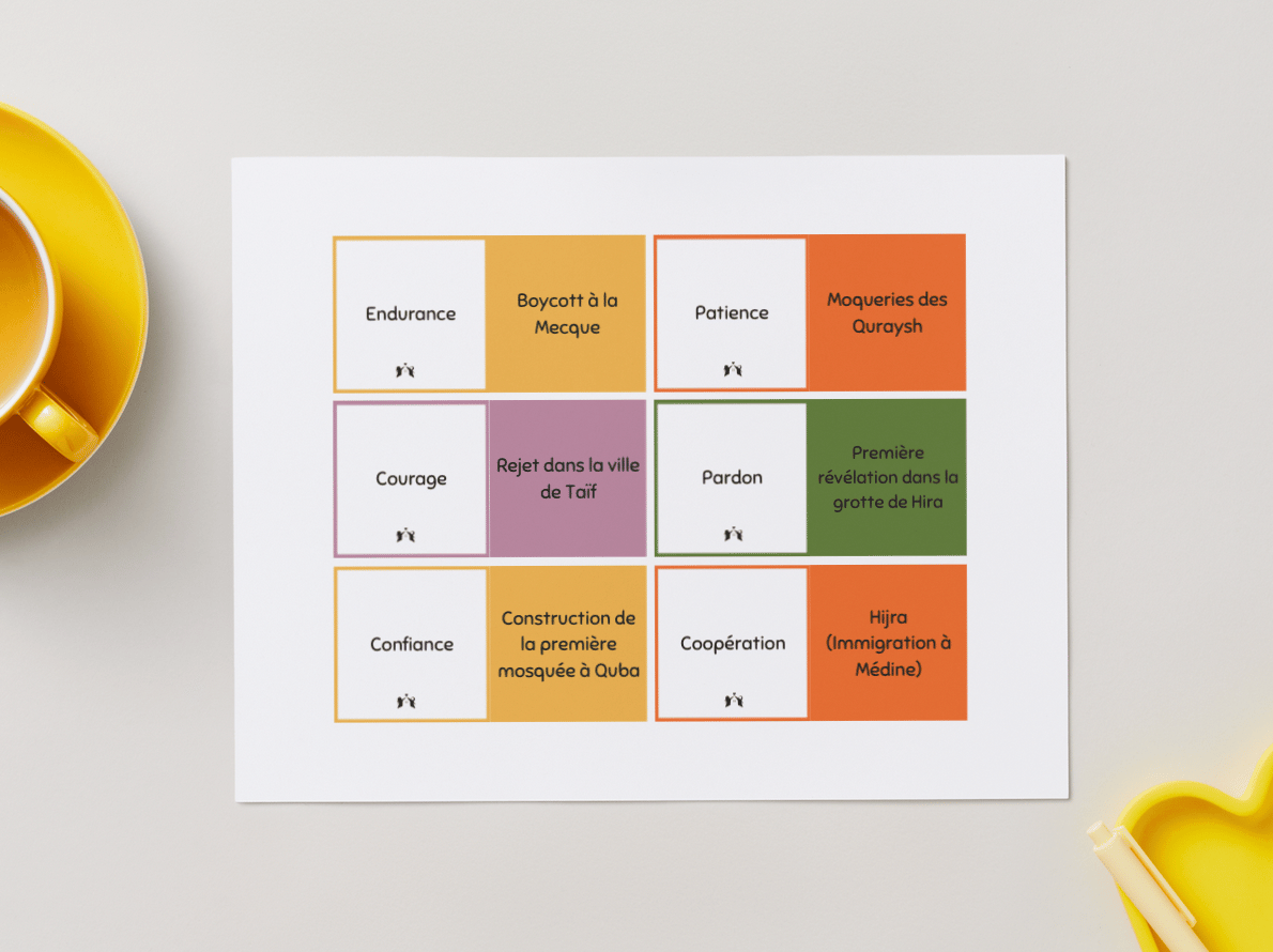 Ce jeu de domino se compose de pièces représentant des événements historiques de la vie du Prophète Muhammad صلى الله عليه وسلم, chacun associé à une valeur importante de l’islam (patience, justice, confiance en Allah, pardon, etc.). Le but du jeu est de reconstituer le parcours de la vie du Prophète tout en comprenant les enseignements qu’il nous a laissés.