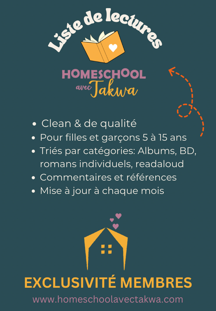 Et ATTENTION, à partir d’octobre, le prix du membership augmentera 15$ par mois. Homeschool avec Takwa fête son premier anniversaire, et grandit ! Plusieurs belles choses s’en viennent.Par contre, ceux qui auront joint avant garderont le prix de 10$ à vie: c’est ma façon de dire merci aux partenaires de la première année à qui je suis si reconnaissante.